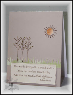 I love the poems of Robert Frost...and so I had to buy Lisa Strahl's stamp set "Motivational Centers" from Cornish Heritage Farms. This week's CAS challenge on SCS was to make a greeting the focal point of your card. I used part of Robert Frost's "The road not taken" as my focal point.
