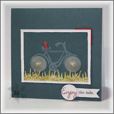 I stamped the bike in white ink on Eucalyptus, one of Amuse's gorgeous new papers and coloured it in with a white pencil crayon. I chose frosted buttons to go with the white bike and threaded them with a teeny bit of twine so that they weren't naked. The bike was grounded with grass. I perched the tiny bird on the seat for a hit of colour...it was stamped in red and coloured over with red glitter pen, then cut out and popped up a bit. I have fat fingers, so this was one seriously challenging fussy cut!! I framed the scene in white and popped it up on the eucalyptus base. I love how the sentiment turned out...the "Enjoy" circle echoes the bike tires and provides a second hit of red. Once this was all assembled, I added a teeny corner of red to the bike scene to make a third spot of red...
